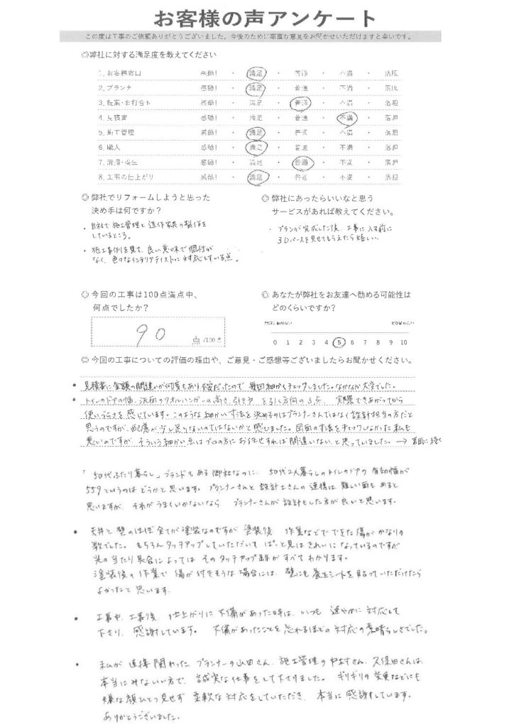 ・工事中、工事後、仕上がりに不備があった時はいつも速やかに対応して下さり感謝しています。不備があったことを