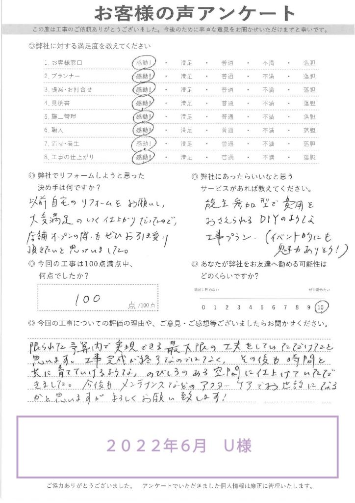 限られた予算内で実現できる最大限の工夫をしていただけたと思います。工事完成が終了なのではなく、その後も時間と共に育てていけるような、のびしろのある空間に仕上げていただきました。今後もメンテナンスなどのアフターケアでお世話になるかと思いますがよろしくお願い致します!
