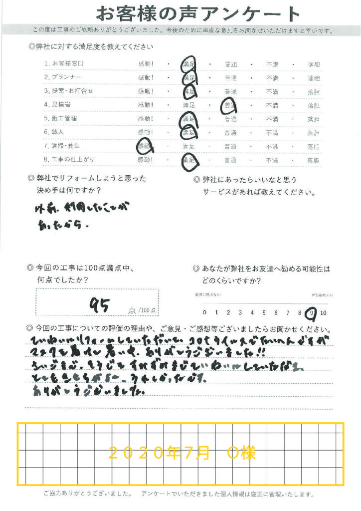 丁寧にリフォームして頂いて、コロナウィルスで大変ですが、マスクを着けて暑い中ありがとうございました。