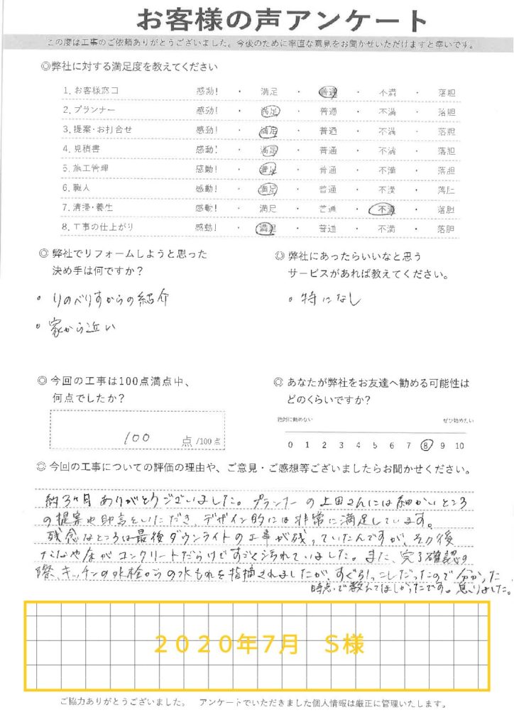 プランナーの上田さんには細かいところの提案や助言を頂き、デザイン的には非常に満足しています。残念なところは最後ダウンライトの工事が残っていたのですが、その後、棚や床がコンクリートだらけですごく汚れていました。また完了確認の際、キッチンの水栓からの水漏れを指摘されましたが、すぐ引っ越しだったので分かった時点で教えて欲しかったです。