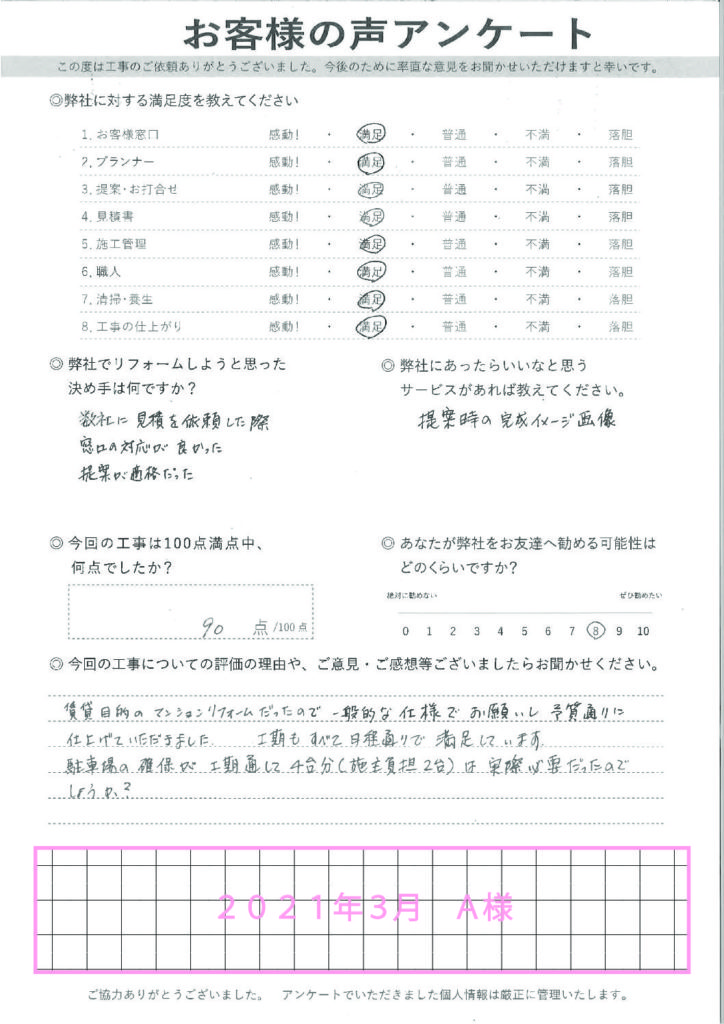 賃貸目的のマンションリフォームだったので、一般的な仕様でお願いし、予算通りに仕上げていただきました。工期もすべて日程通りで満足しています。
