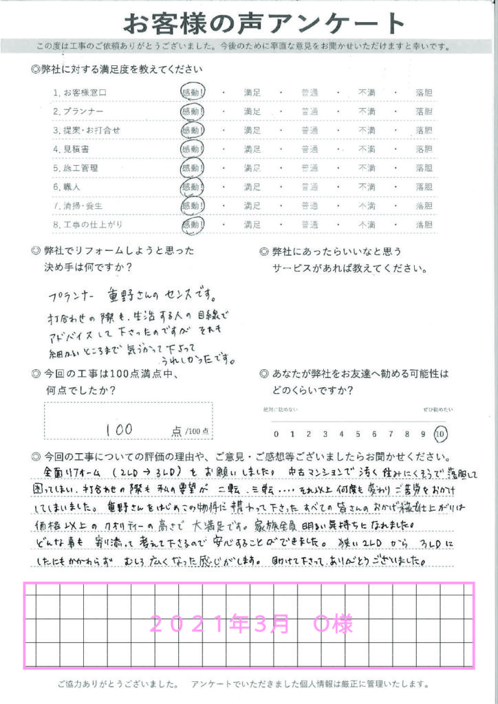 中古マンションで汚く住みにくそうで落胆して困ってしまい、打合せの際も、私の要望が二転、三転・・・それ以上、何度も変わりご苦労をおかけしてしまいました。