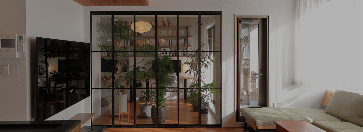 リビングの一角。 アルミ製の間仕切りで緩やかにゾーニングしたワークスペースを造作。 リビングとのつながりを意識しつつ、仕事に集中できる「丁度よい」おこもり感を実現しました。