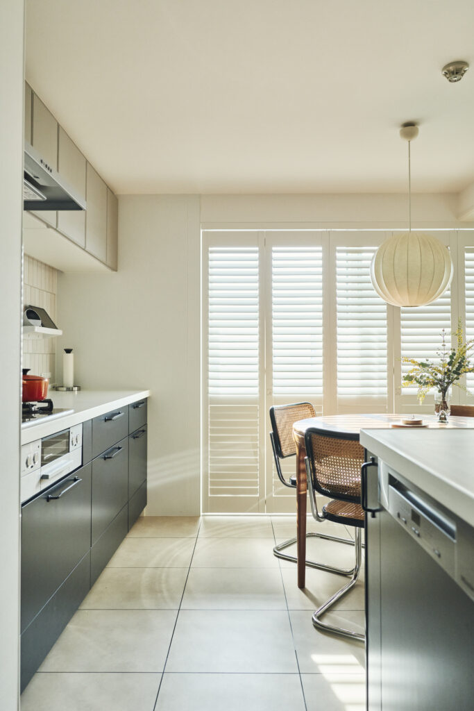 白いウッドシャッターからこぼれる光、モールディングが縁取るアールの垂れ壁、一つ一つ吟味された家具…。 Aさま邸にお邪魔したスタッフ一同、思わず感嘆のため息を漏らしました。「パーツまで…