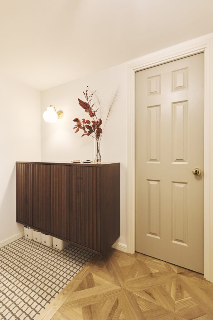 色を揃えないドア、ヘリンボーンの床など