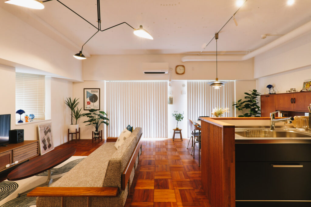 つややかなあめ色のパーケットフローリング、キッチンを囲むレトロなリブパネル、存在感たっぷりのミッドセンチュリーのシーリングライト…空間のすみずみまでこだわりが感じられるTさま宅のリビン…