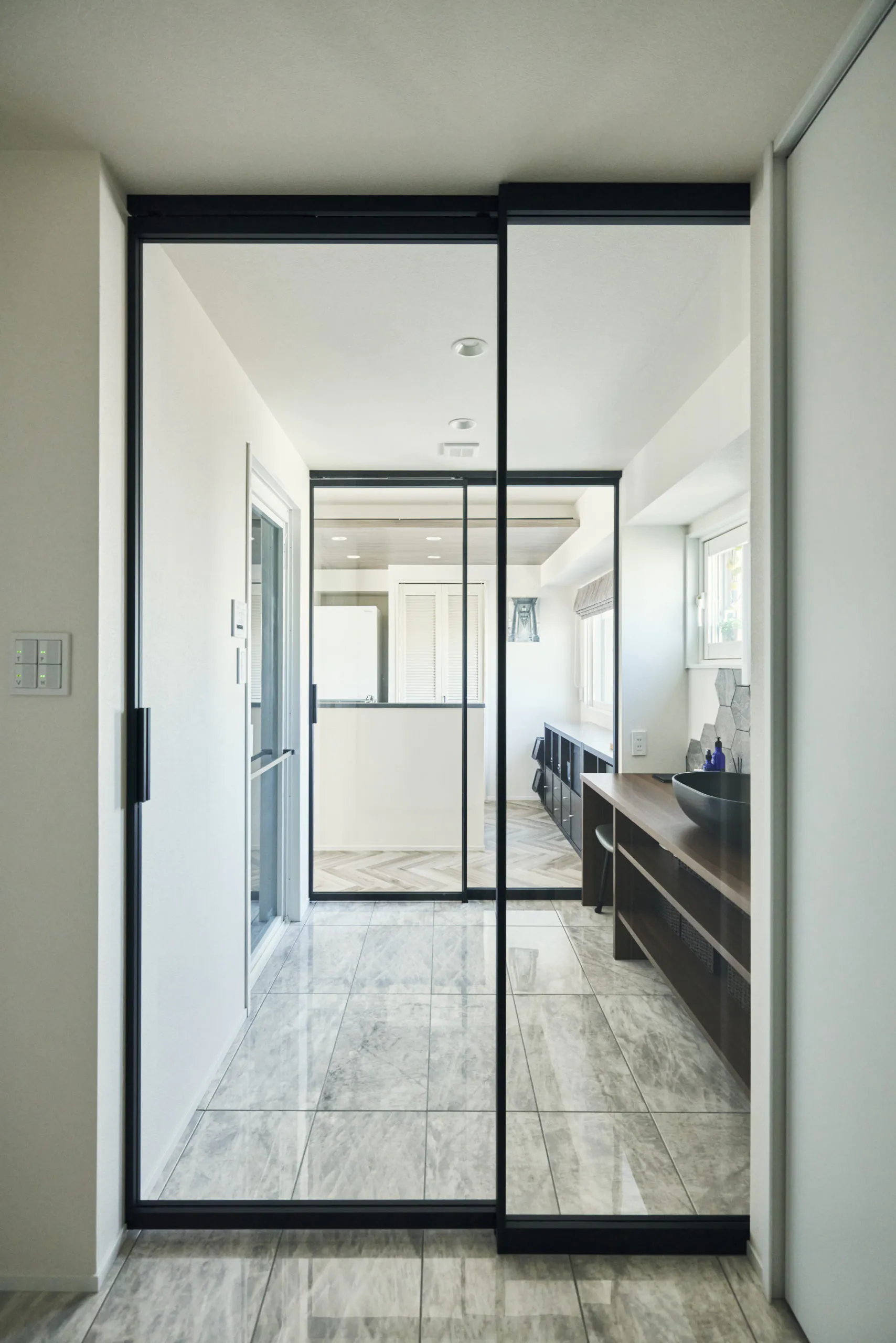 例えば、ガラスで仕切られたホテルライクな洗面室は、キッチンやバスルーム、ランドリールームとも直接つながる便利な動線と、見通しのいい間取りがおしゃれです。