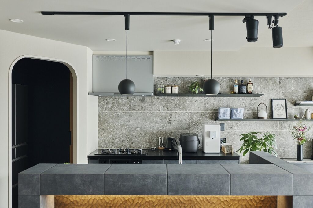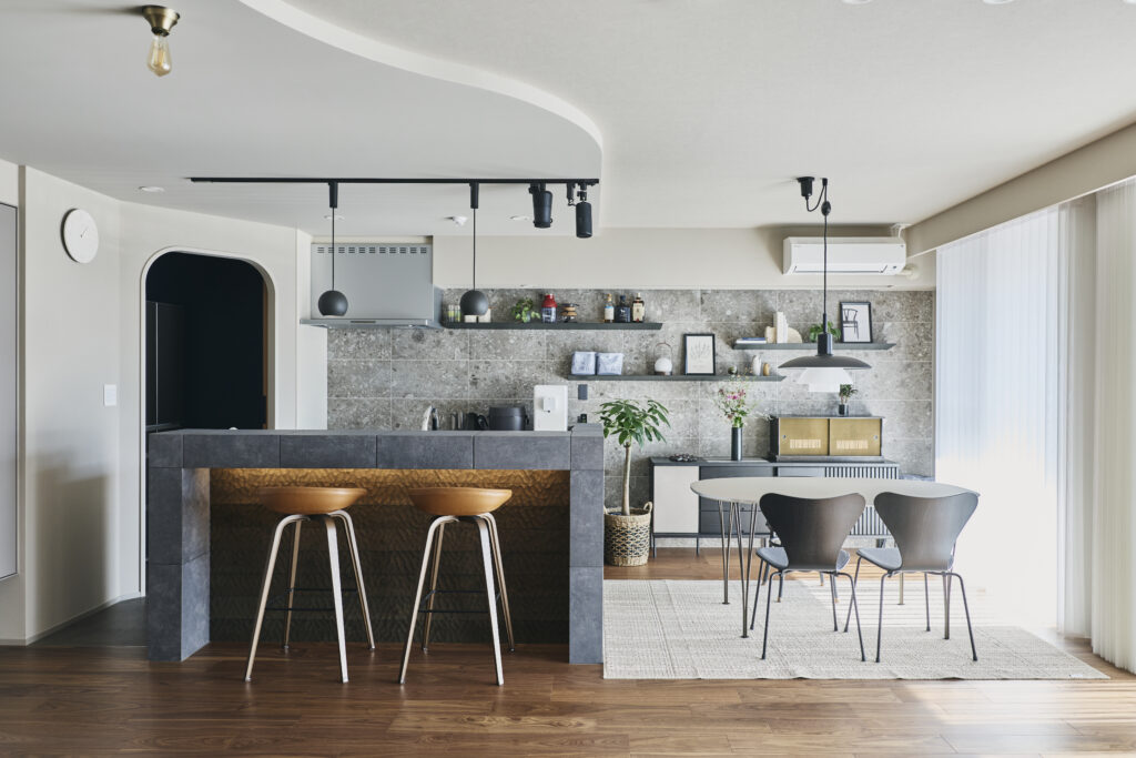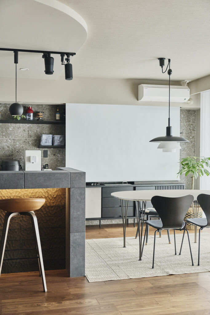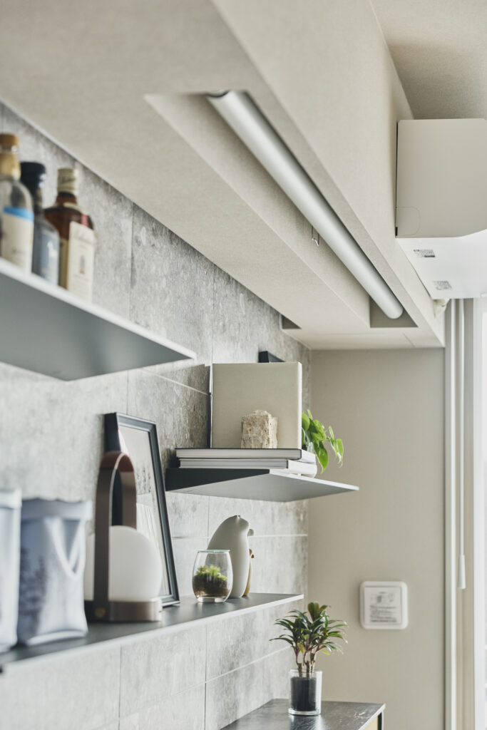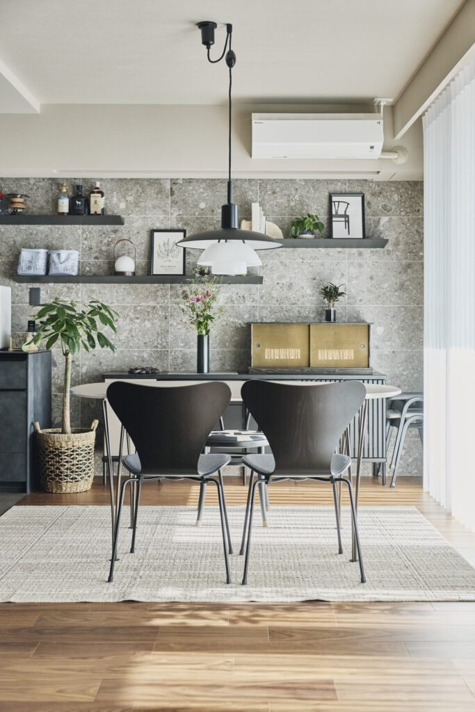 ライトグレーのテラゾー調の壁が印象的なダイニング側には、テレビを置く予定だったそうです。「最後までテレビを置くか悩んだのですが、壁のタイルを見せたかったですし、見た目をスッキリさせるためにやめました」と奥さま。代わりにウォールシェルフを設置してお気に入りのものを飾る場所にしました。