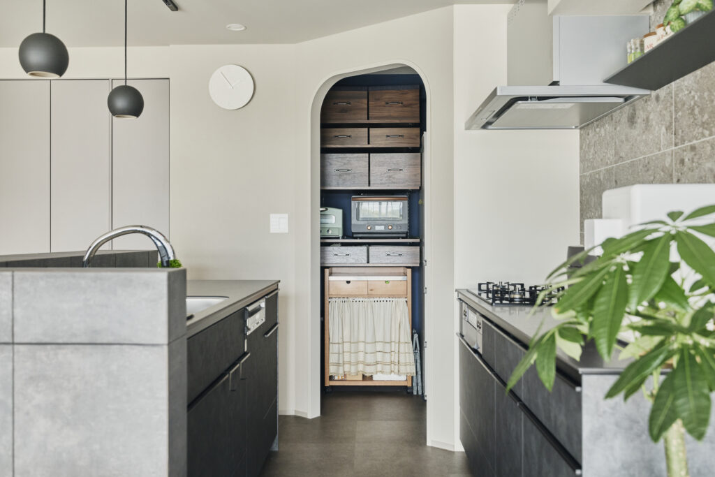 パントリーは奥さまのご提案。「隠せる場所がいっぱい欲しくて、キッチンにも独立して収納できるスペースを設けました」。入口のアール壁や、内側のブルーのアクセントクロスなどさりげない演出が目を惹きます。