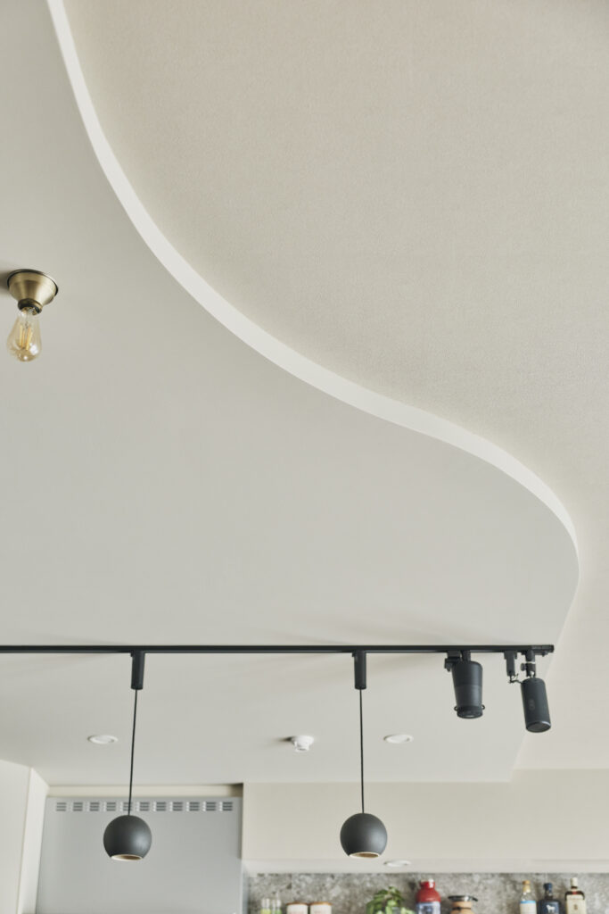 天井にある高低差を利用して作った曲線の装飾がおしゃれ!実は、躯体の関係でどうしても段差ができてしまうならと、見た目を楽しめるようになされた工夫です。Nさま邸には所々に曲線があり、各所のアクセントとしてだけでなく、各所をつなげる役割も持っています。