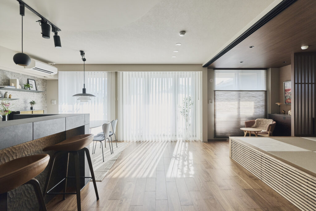 小上がりと窓側のスペースを含むエリアは、特に和モダンを意識しており、壁は漆喰調のクロスを採用。また、全体が白くなりすぎないようにと天井は木目調にしており、リビング・ダイニングの統一感を邪魔しないゾーニングがされています。