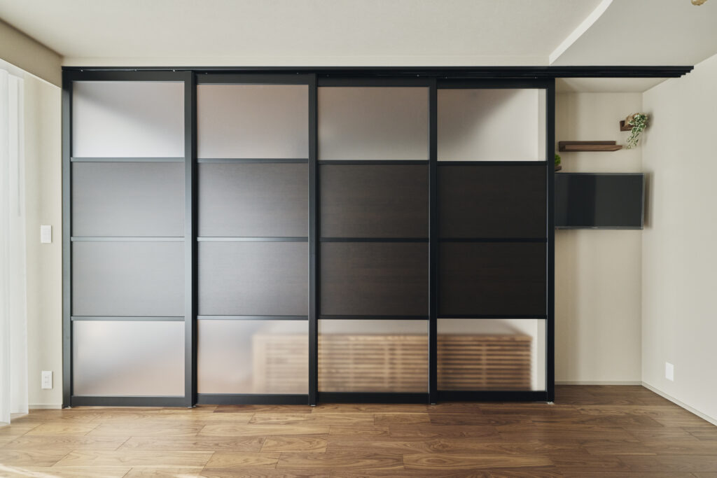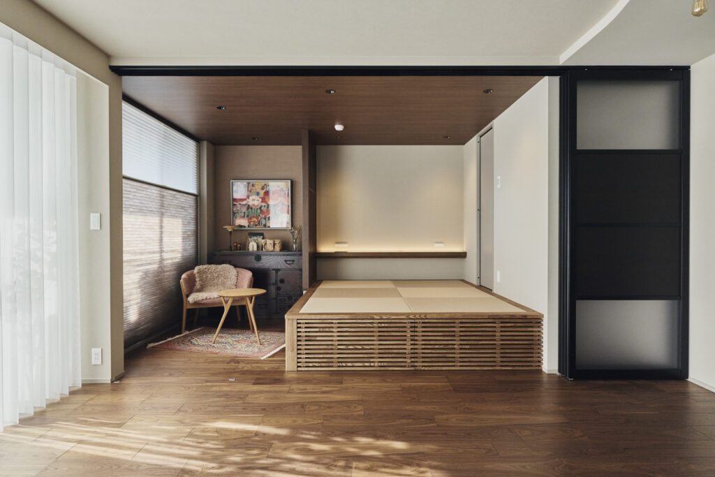 畳敷の小上がりは、畳に座ったり寝そべったりとくつろぐ場であり、夫婦の寝室でもあります。そのため、シチュエーションに応じてリビング・ダイニングと仕切れるように天井から吊られた4枚のスライドドアを設け、開放的な空間と夫婦のプライベートな空間を共存させました。