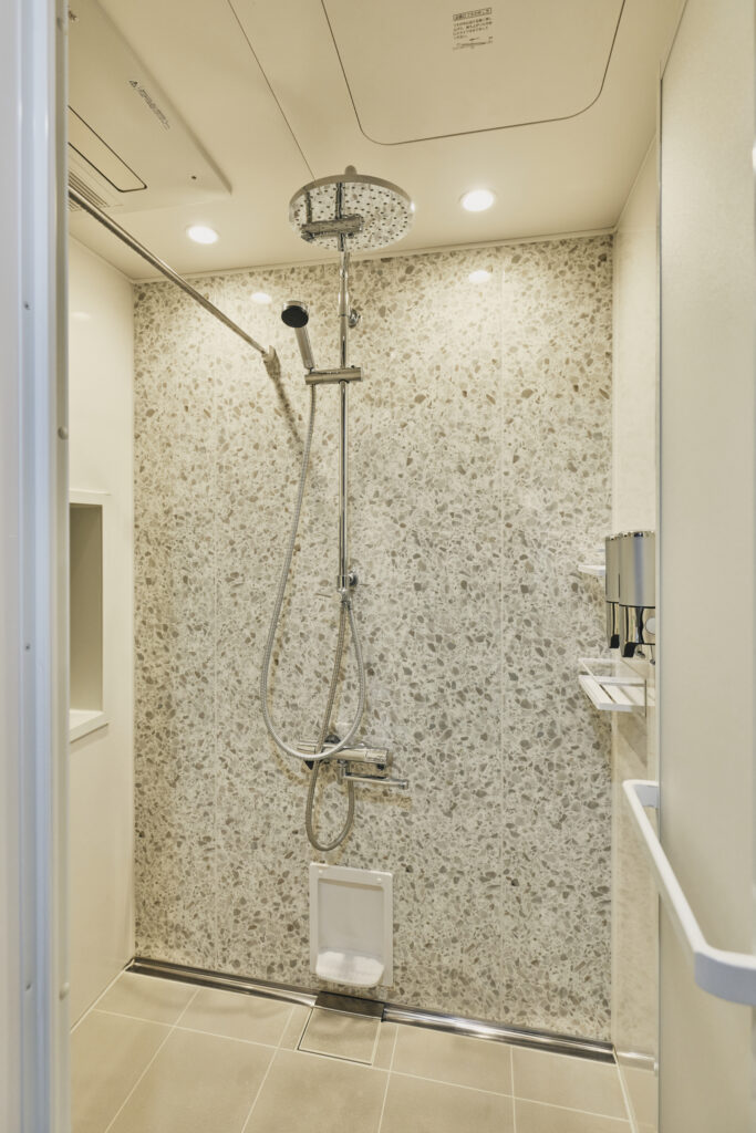 浴槽がない分、お湯を全身に浴びることができるオーバーヘッドシャワーを採用。壁はキッチンに合わせてテラゾー柄のタイルが使われています。