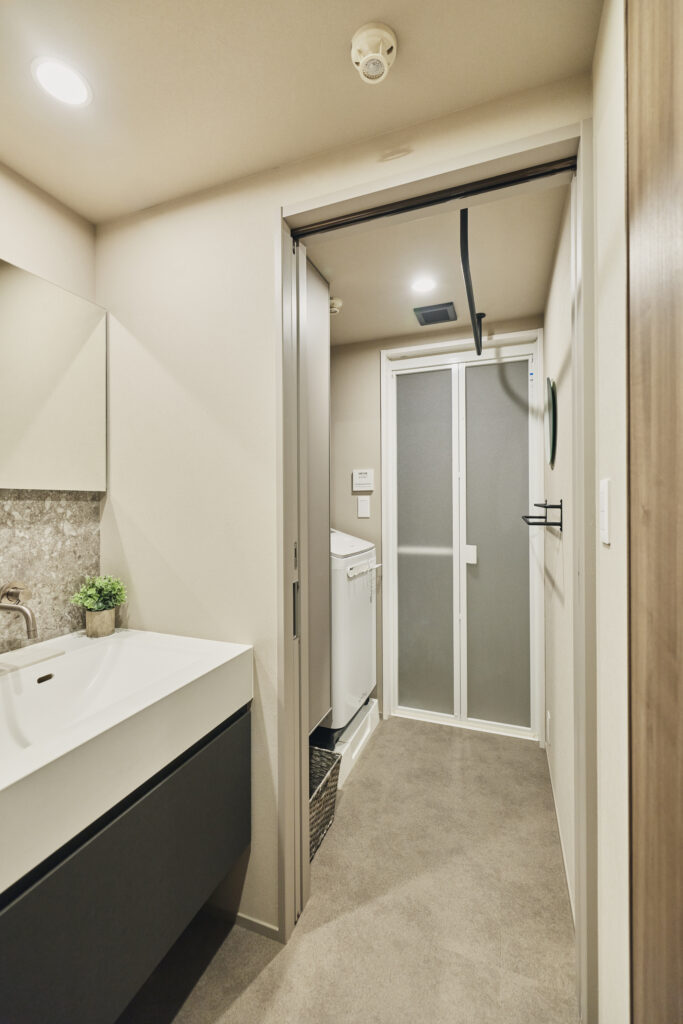 浴槽をなくしてシャワー室にしたことで生まれたスペースで、広い玄関と洗面室を作ったのも大きな特徴。「家族で話し合って、普段はシャワーで十分だねって。掃除も楽ですし、室内干しができるスペースもできてよかったです」と奥さま。