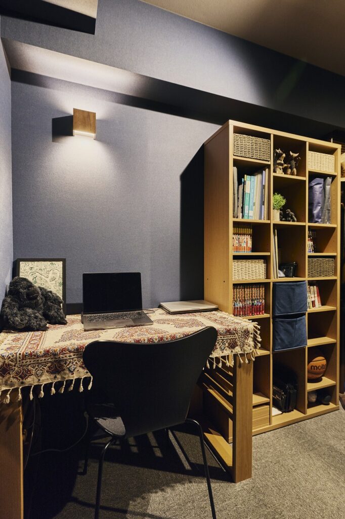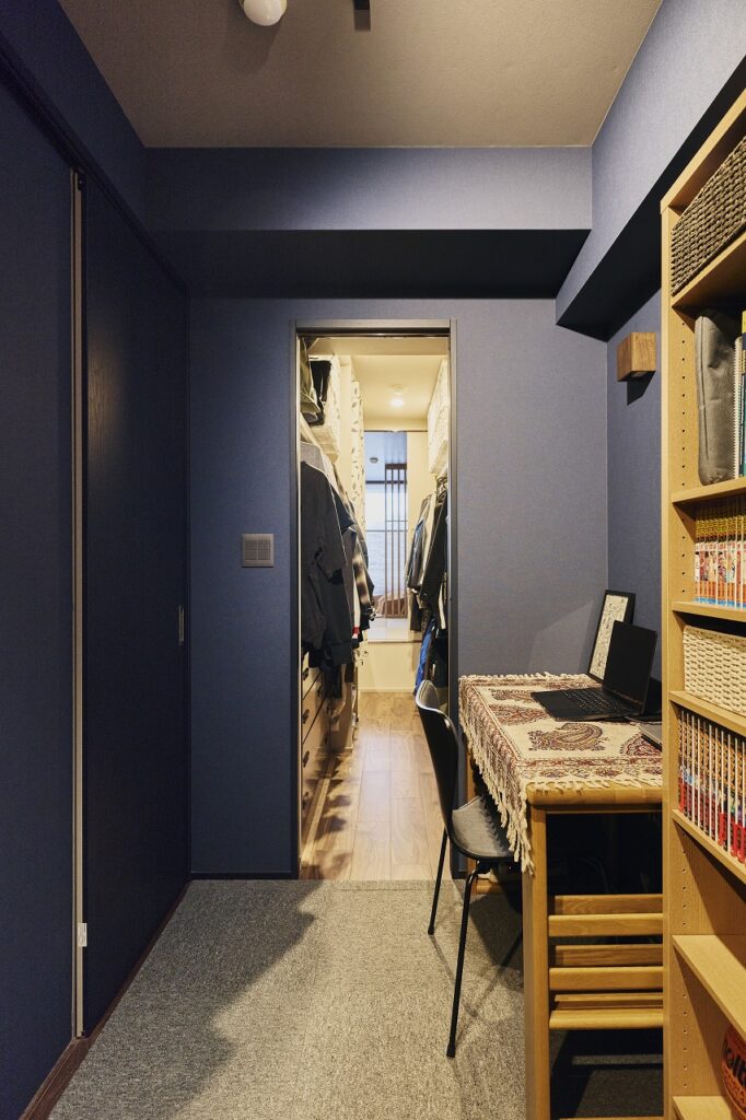 お子さまたちの部屋はネイビーのクロスを採用し、全体のテーマである和モダンというよりブリティッシュ調に。この部屋は最終的にご主人が使う予定なのだそう。「アクセントとして1カ所雰囲気の違う場所を作りたくて。ブリティッシュパブをイメージしていて、息子たちが巣立った後にバーにして、息子の野球友達のお父さんたちとくつろぐ場にしようと思っています」。