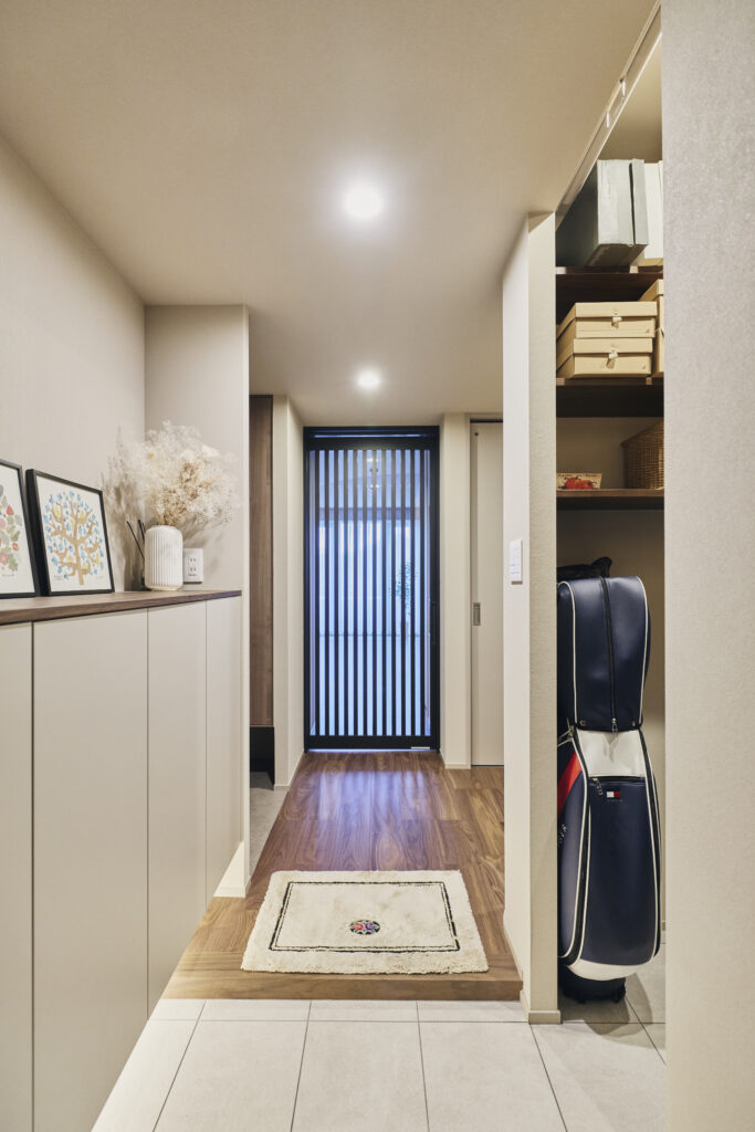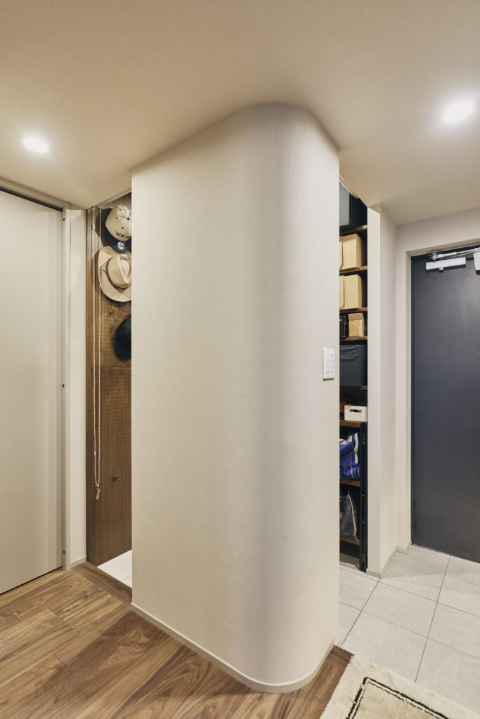 土間の奥からも室内に上がれるようにしたことで、玄関に靴が溜まりがちだった問題も解消。そして、こちらもアール壁が。「パントリー入り口のアール壁と関連づけて一つコンセプトになると思ってお願いしました」とご主人。土間の入り口にはロールスクリーンがあり、来客時には中が見えないようにできる工夫がされています。