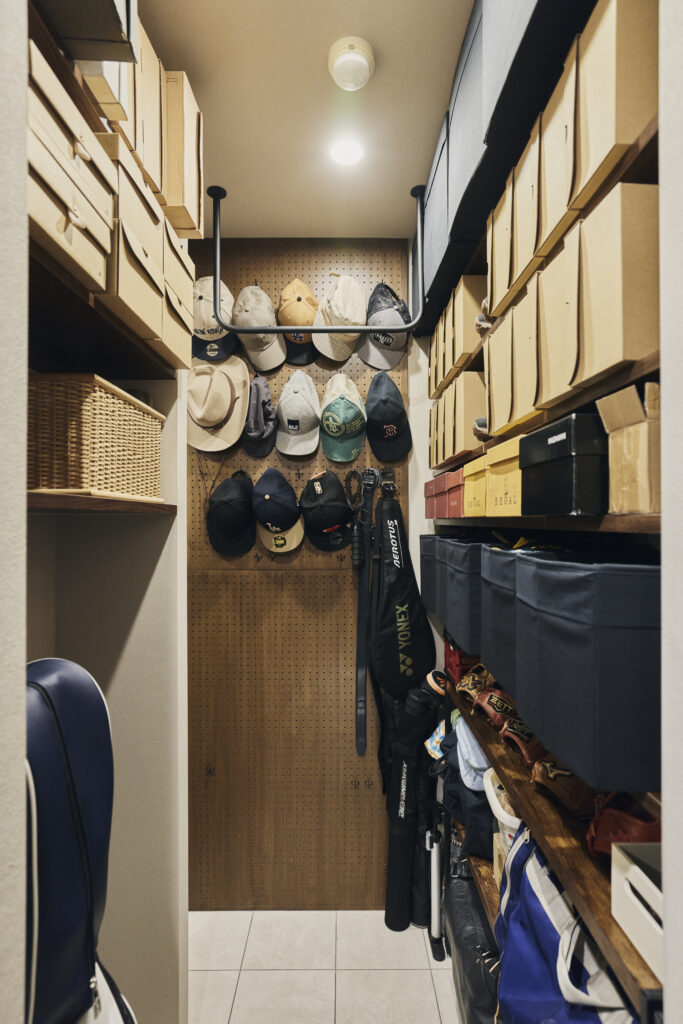 稼働棚や有孔ボードがある土間を設けることで、汚れがちな野球道具を玄関周りに集約。天井には濡れた雨具や、来客時にはゲストの上着をかける時に使えるようにとパイプを設置しました。