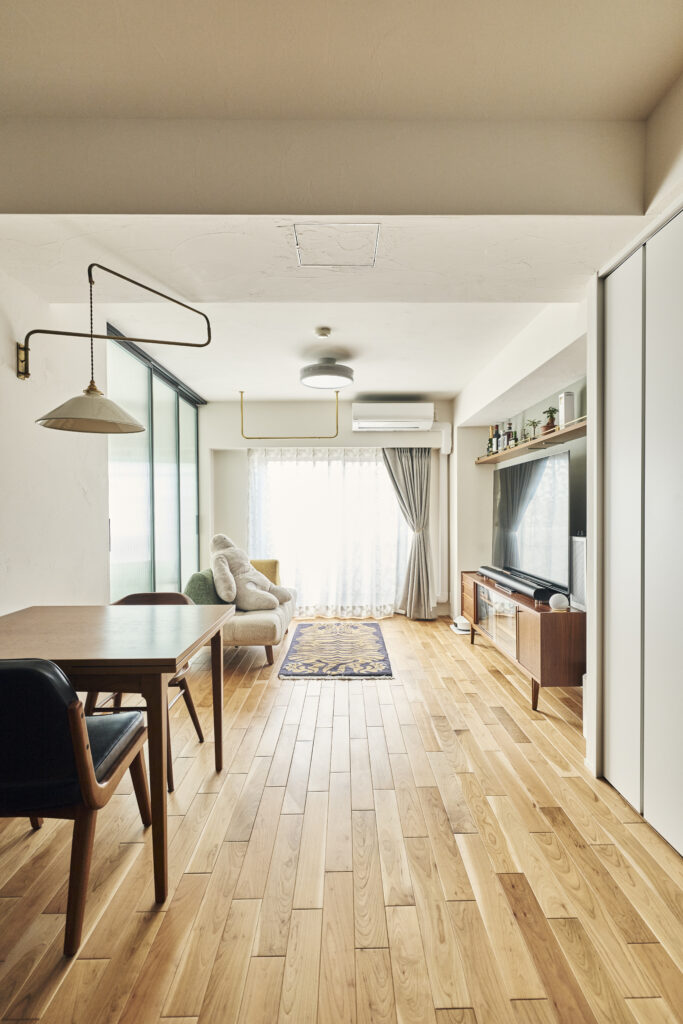 統一されたインテリアテイストとともに、空間の品格を高めているのがフローリングや壁の上質な質感です。ここはご主人のこだわり。「両親のリノベも自然素材を使ったものでしたので、調湿作用のある珪藻土壁や、無垢フローリングの快適さを実感していました」とご主人。