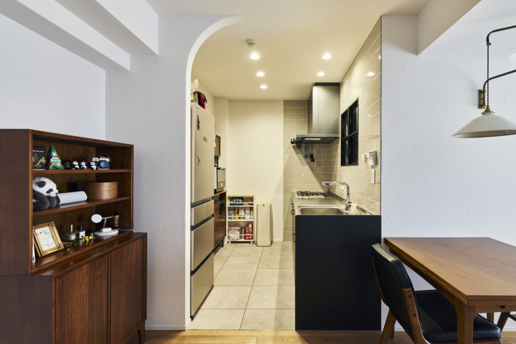 スイッチニッチの向かい、キッチンとの境目にもアール壁を設けています。「冷蔵庫を隠すために設ける壁もスイッチニッチに合わせてアールにしては、と森さんが提案してくれたものです」と奥さま。空間のテイストに合う、さりげない曲線が上品です。
