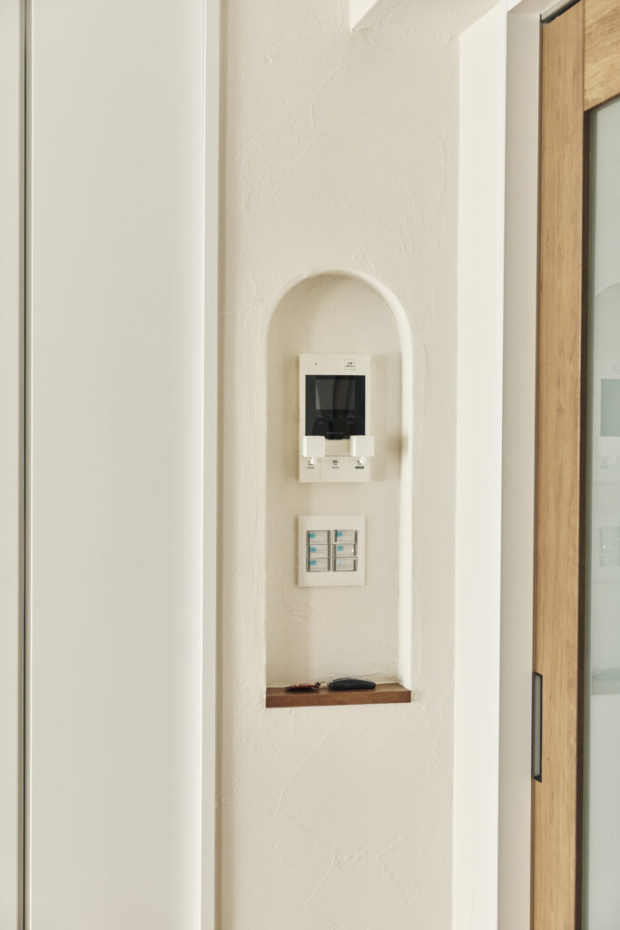 LDKの入口横にはアーチ型のスイッチニッチが。奥様がSNSで作例を見て取り入れたポイントです。珪藻土塗りの質感のおかげでいっそう素敵ですね! ちなみにインターホンに付いている小さな四角形は「スイッチボット」。ご主人のこだわりで、ご自宅中のものが可能な限りスマートスピーカーで操作できるようになっているのです。
