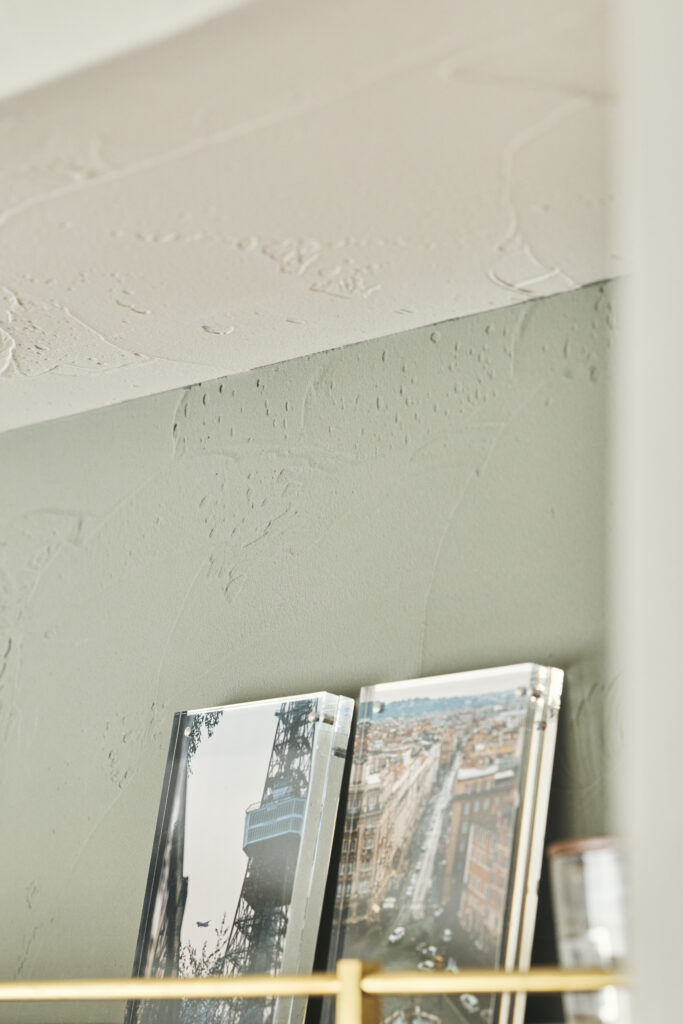 壁は珪藻土塗りに。全体の壁に加えて、LDKは天井まで珪藻土塗りです。左官仕上げならではの風合いも表情豊か。ご主人によると珪藻土塗りのお部屋は「調湿作用のおかげで夏は涼しく、冬も暖かい」のだそう。