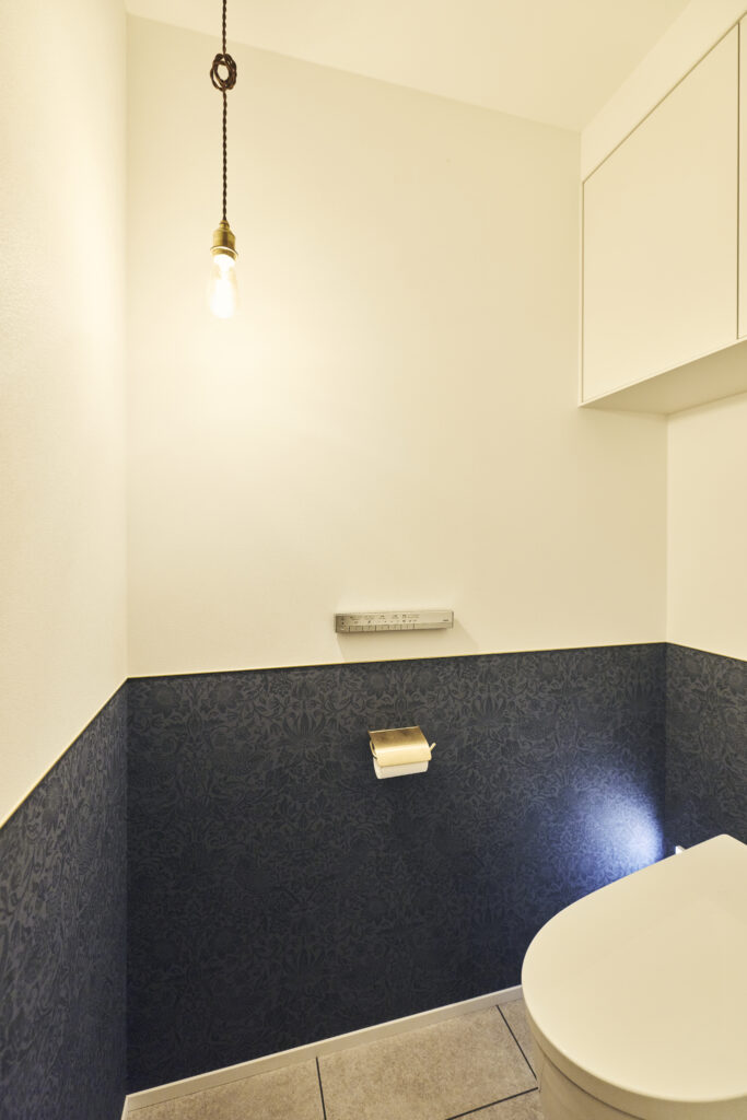 浴室とトイレは「TOTO」を採用。トイレは腰壁を「サンゲツ」のウィリアム・モリス「いちご泥棒」柄の壁紙を使っています。真鍮のペーパーホルダーとの組み合わせもエレガントですね。「モリスの壁紙をどこかに使いたいと思っていたところ、この使い方を森さんにご提案いただいて。濃い色を全面に貼ると重くなりそうですし、この使い方だと汚れも気になりにくいので気に入っています」とお二人。