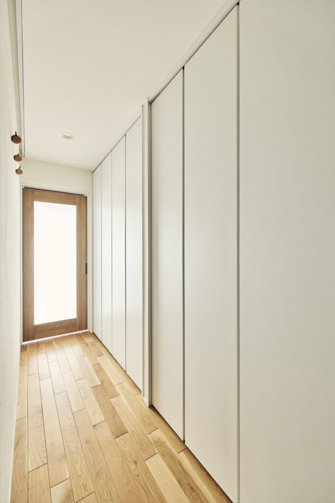 廊下の片側の壁も、全面を収納に。こちらはご夫婦それぞれのクローゼットやタオル類の収納スペースです。「脱衣室とも近く、動線上も便利です」とご主人。