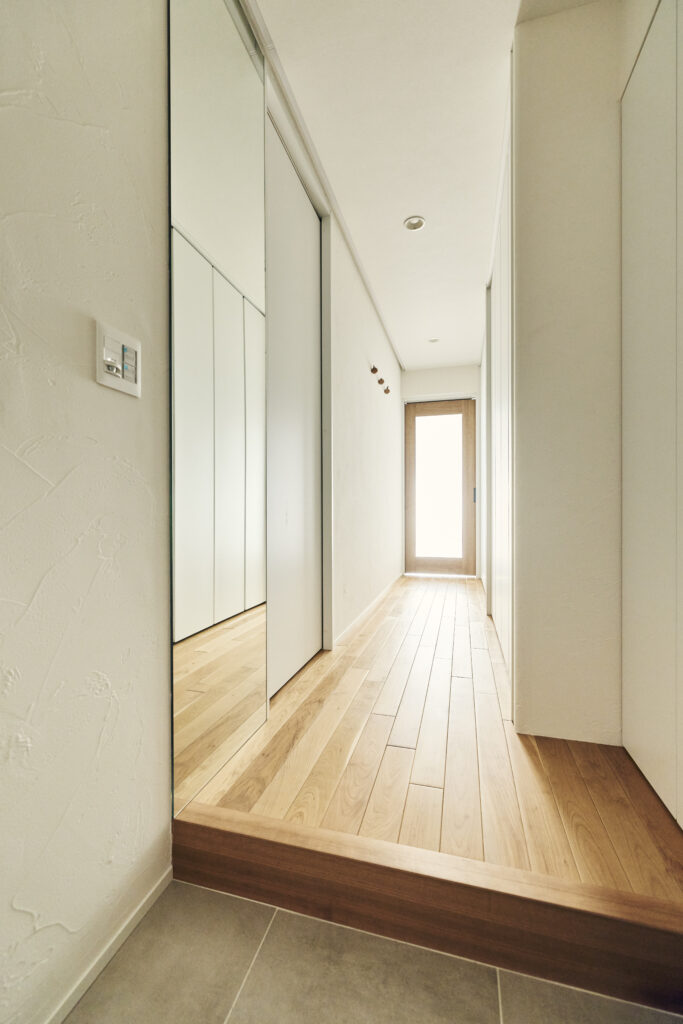壁面収納は玄関にも。スキーやスノボの板をしまえる高さで便利なのだそう。向かいの壁に鏡を設置したのは奥さまのアイデアです。「玄関に鏡があると空間が広く見えていいなと思って。私たちは身長差が30cm近くあって既製品の姿見だとどちらかが見づらくなることが多いので、造作にしました」と奥さま。ロボット掃除機で傷付くのではと心配していたそうですが、問題なく使えているそう。