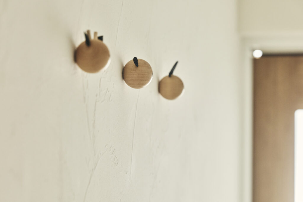 廊下の天井には間接照明も仕込んであります。壁には、ころんと丸いアニマル型のウッドフックを3つ並べて愛らしいアクセントに。