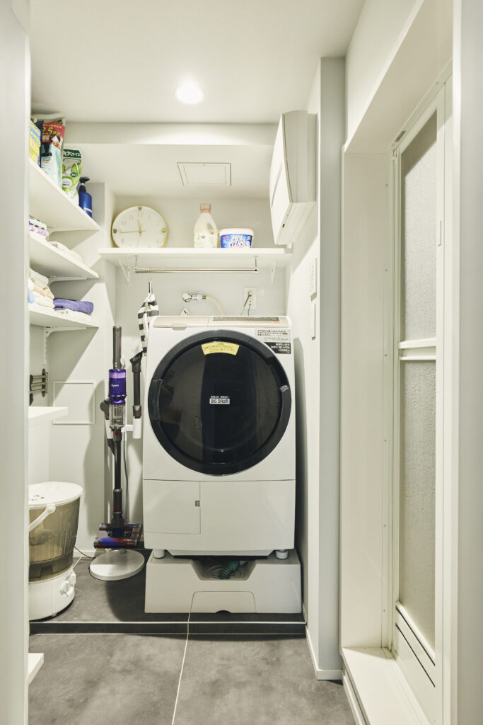 引き戸の奥は脱衣所兼ランドリールームと浴室です。こちらにも扉は設けずオープン棚を造作。「以前の家はランドリーが狭かったんですが、お風呂を入るときに使うタオルや洗剤のストックなどもここに置けるようになって便利になりました」