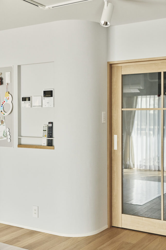 「プランナーの森さんにスイッチニッチが欲しいなと相談したら、リモコンステーションも作りましょうと提案してくださって」。リモコンが迷子になりづらくて便利ですね。転び止めのバーは「上手製作所」に白い塗装を特注したもの。「リクシル」の引き戸の白い取手やスイッチとも統一感があります。