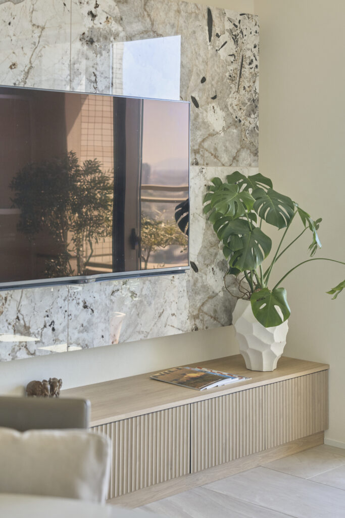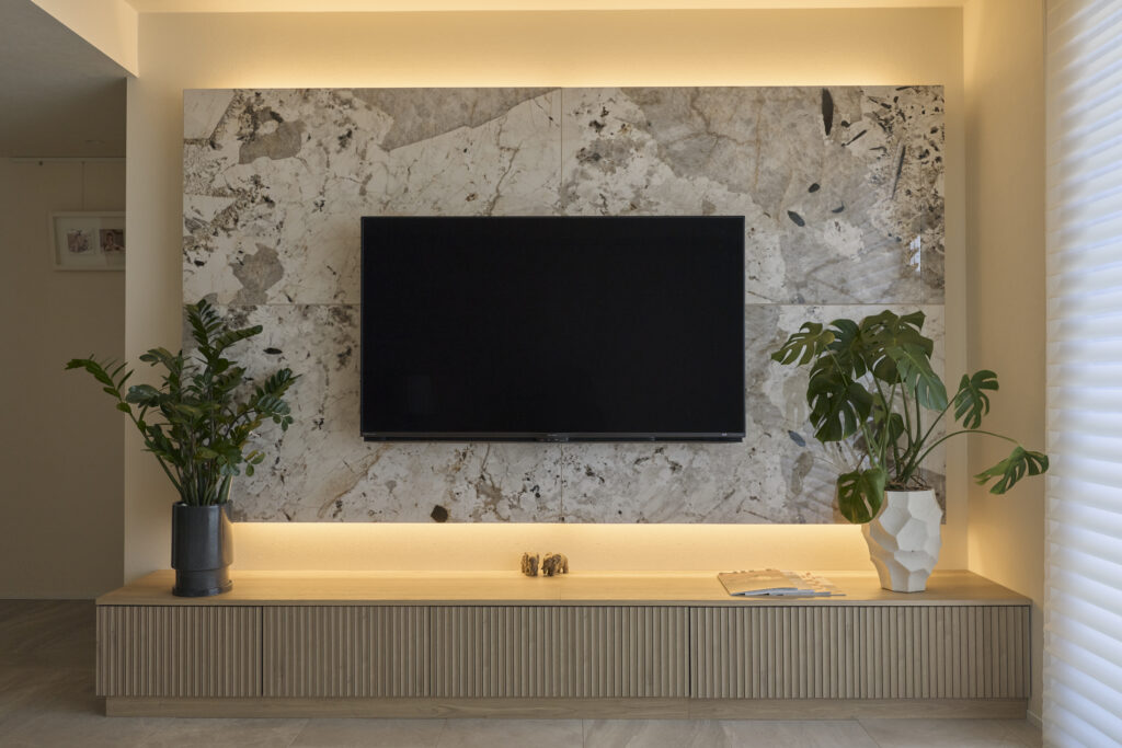 大理石を採り入れたのは床だけではありません。壁かけTVの背面の壁にも、天然の石目が美しい大理石があしらわれています。