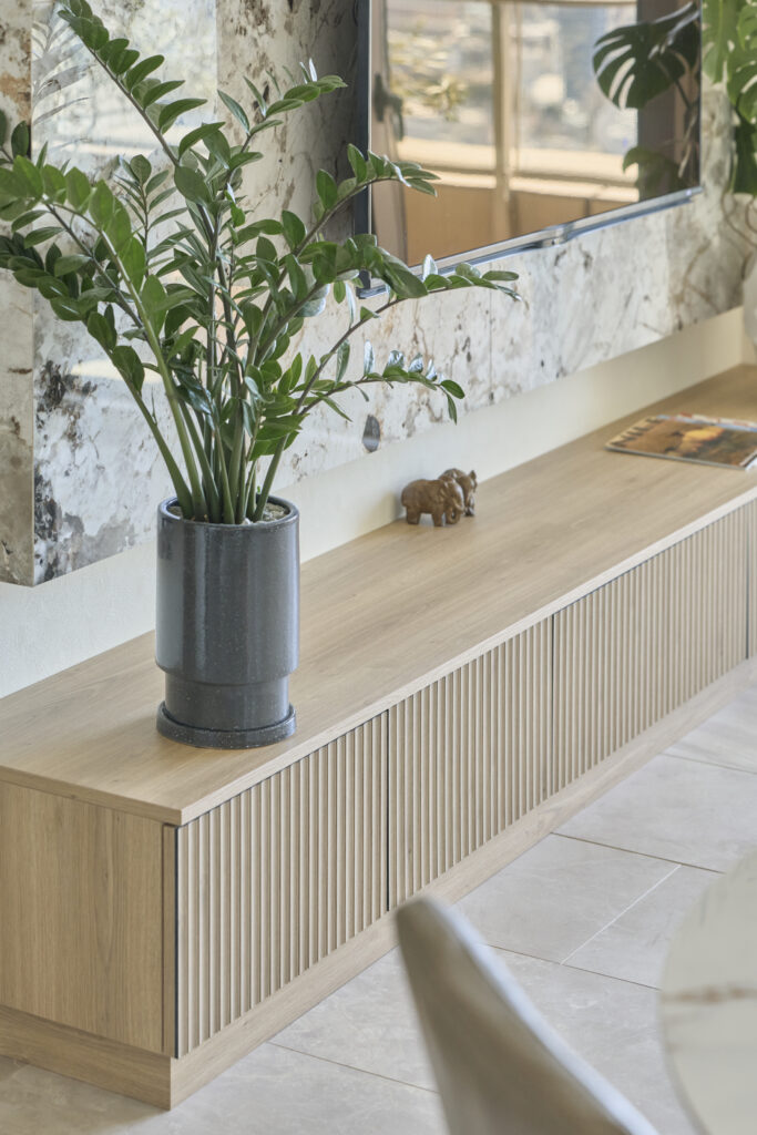 造作したTVボードの白木のような色合いと縦のラインを生かしたデザインも、さりげなくジャパンディの空気感を漂わせています。