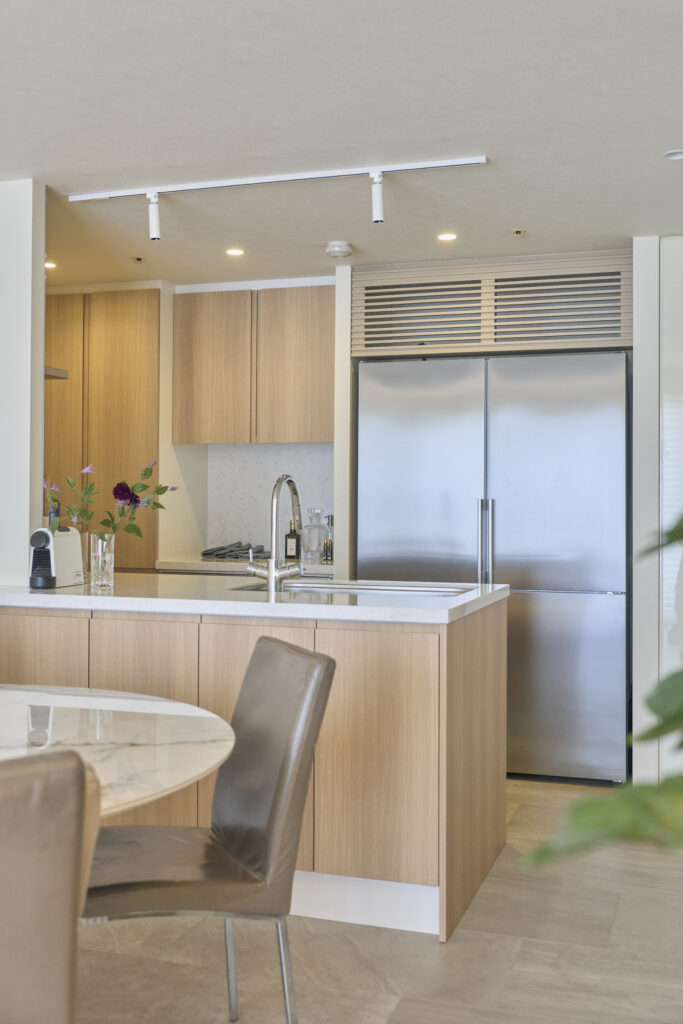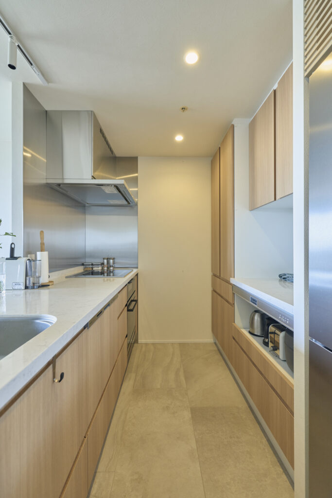 インテリアのテーマカラーをここでも生かし、扉の面材は明るい木目を選択。ビルトインオーブンレンジや食洗機など、これまで便利に使っていた設備はリニューアルして再導入されました。