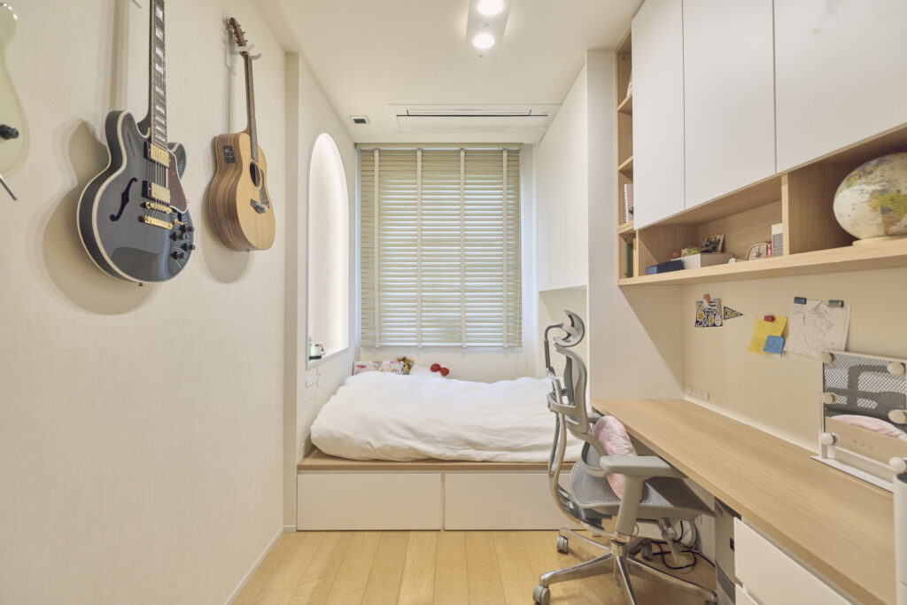 「もっと機能的で使いやすく、インテリアも素敵な部屋にしてあげたいという思いを温めていました。ここでも海外事例をお手本に、ベッド・デスク・収納をすべて造作にするプランをお願いしたんです」
