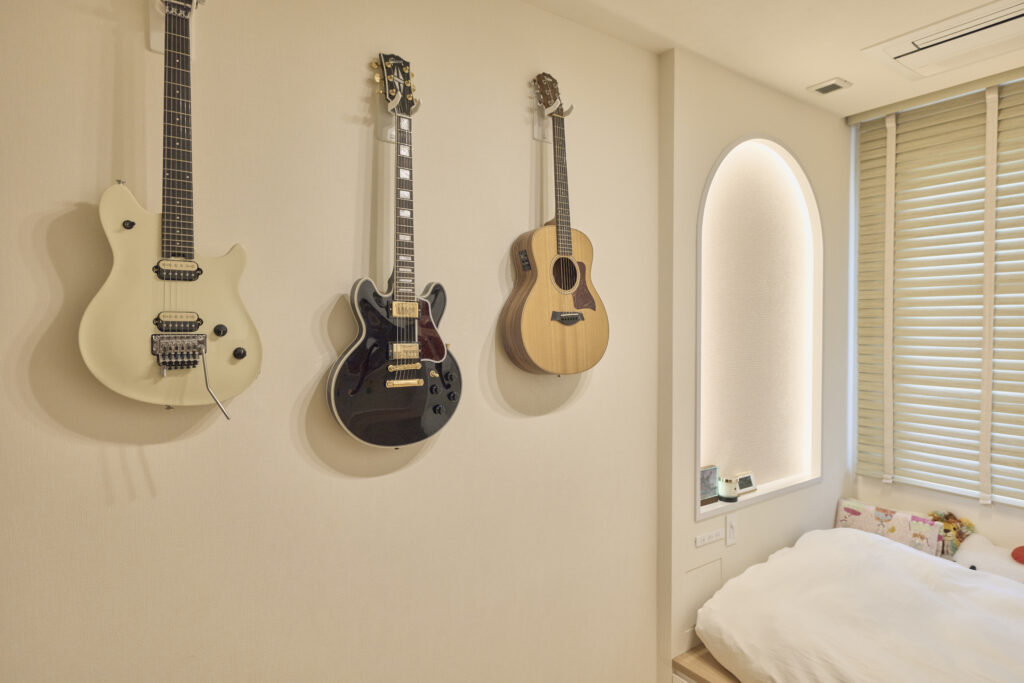 壁面にはフックをつけて、ご趣味のギターをディスプレイ。こちらも置き場所に困っていたそうで、これまではギタースタンドで家のあちこちに点在していたのだとか。3台が1か所にまとまり、見た目にもカッコいいインテリアになりました。