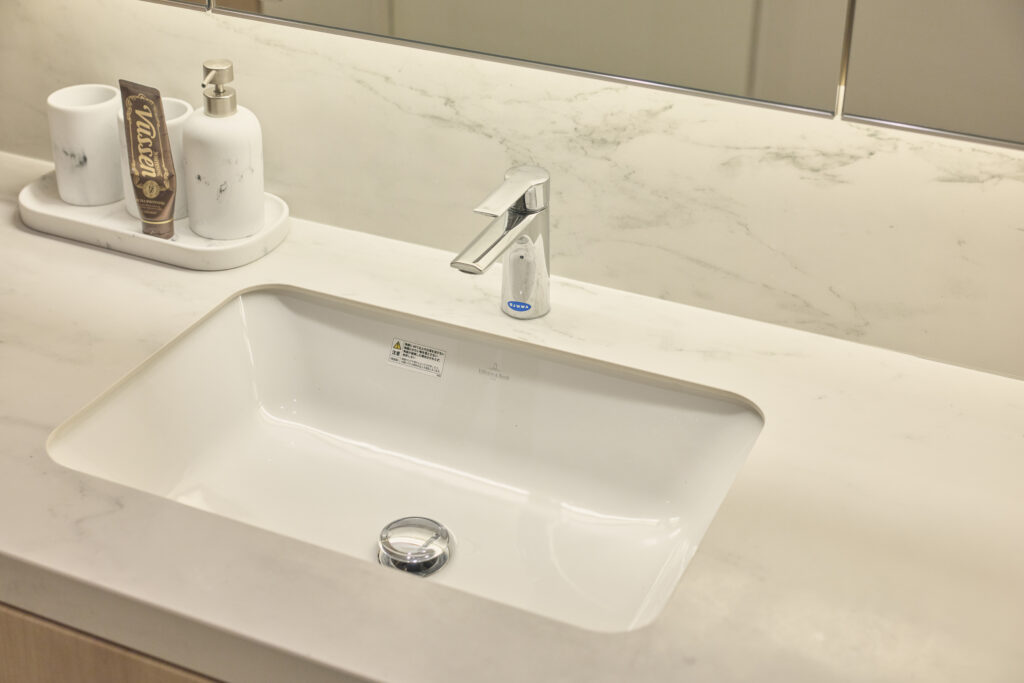 床に採り入れた「アドヴァン」の大理石「マーベルトラベルティーノ」もホテルを思わせる雰囲気。広さやレイアウトを変えなくても、ここまでイメージが変わる!という好例です。