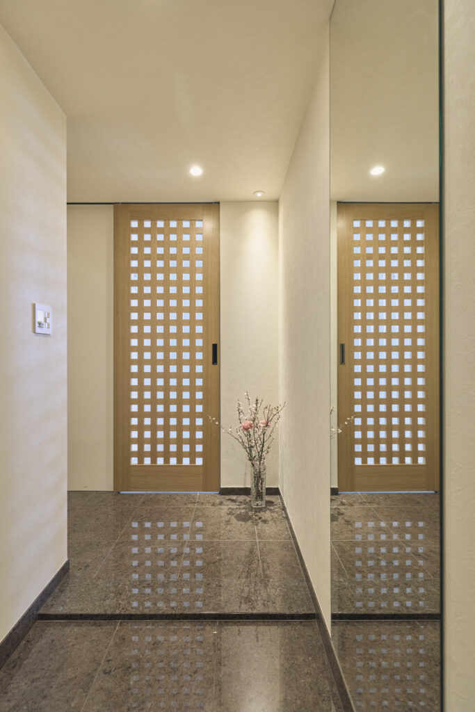 リビングドアは「神谷」の木製引き戸。すっきりとした格子戸のようなデザインがジャパンディのような印象を与えます。ガラスを通して玄関ホールに光が届くのもポイント。