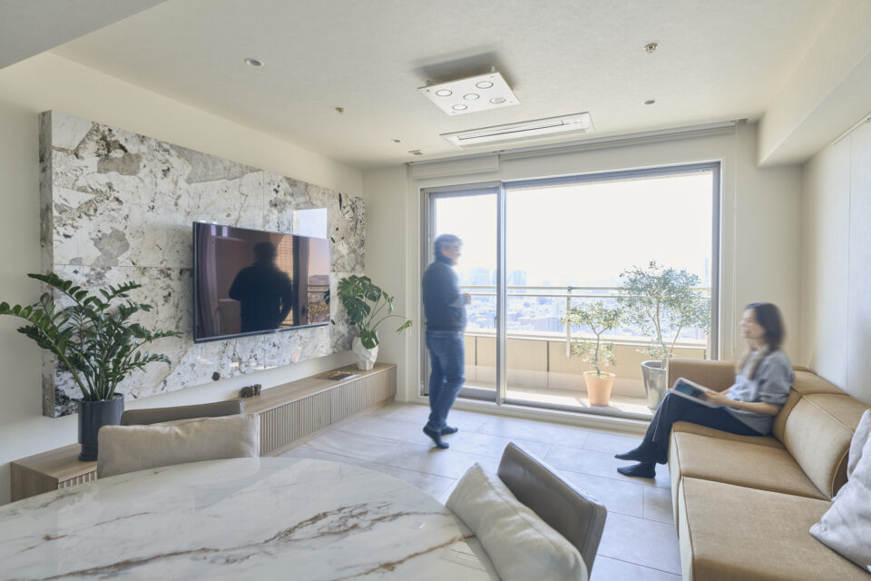 リビングにお邪魔すると、目を見張るような洗練された空間が広がっていました。大理石がふんだんに使われた室内は、まるでハイクラスなホテルのよう。窓からの眺望とあいまって、上質な心地よさにあふれています。